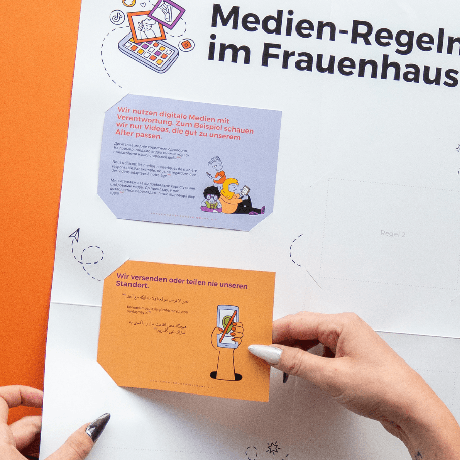 Mit dem Plakat „Medien-Regeln im Frauenhaus“ werden Fachkräfte dazu eingeladen, partizipativ mit im Frauenhaus lebenden Kindern und Jugendlichen Medien-Regeln zu erarbeiten. Aus insgesamt 12 Regel-Vorschlägen können Frauenhaus-Mitarbeitende diejenigen Regeln auswählen, die für ihr Haus gelten sollen. Es können auch eigene Regeln gestaltet werden.